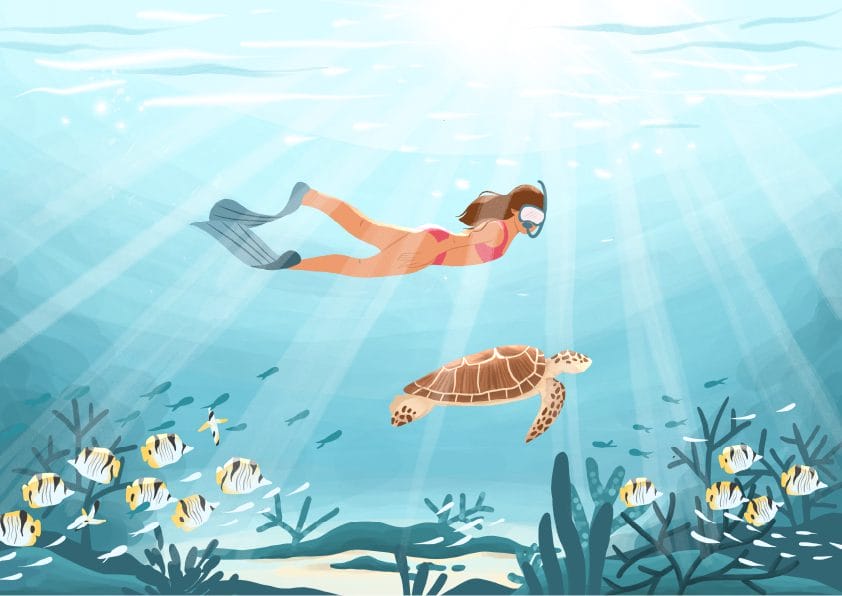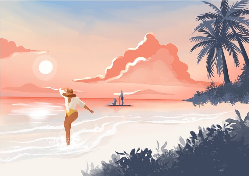 With her passion for illustration and experience, her works show a glimpse into the soulful life on our small bright island – from swimming with majestic manta rays and graceful whale sharks, to dancing against the backdrop of pastel pink sunsets or the starry night sky.