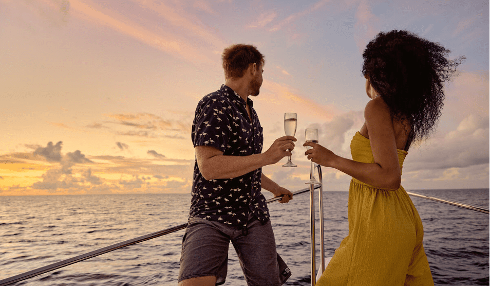 As dolphins frolic under the glow of the descending sun, you will be awestruck by the grandeur of nature’s show. Marvel at the shifting hues of the sky, all while enjoying a glass of champagne to celebrate your romantic tale.